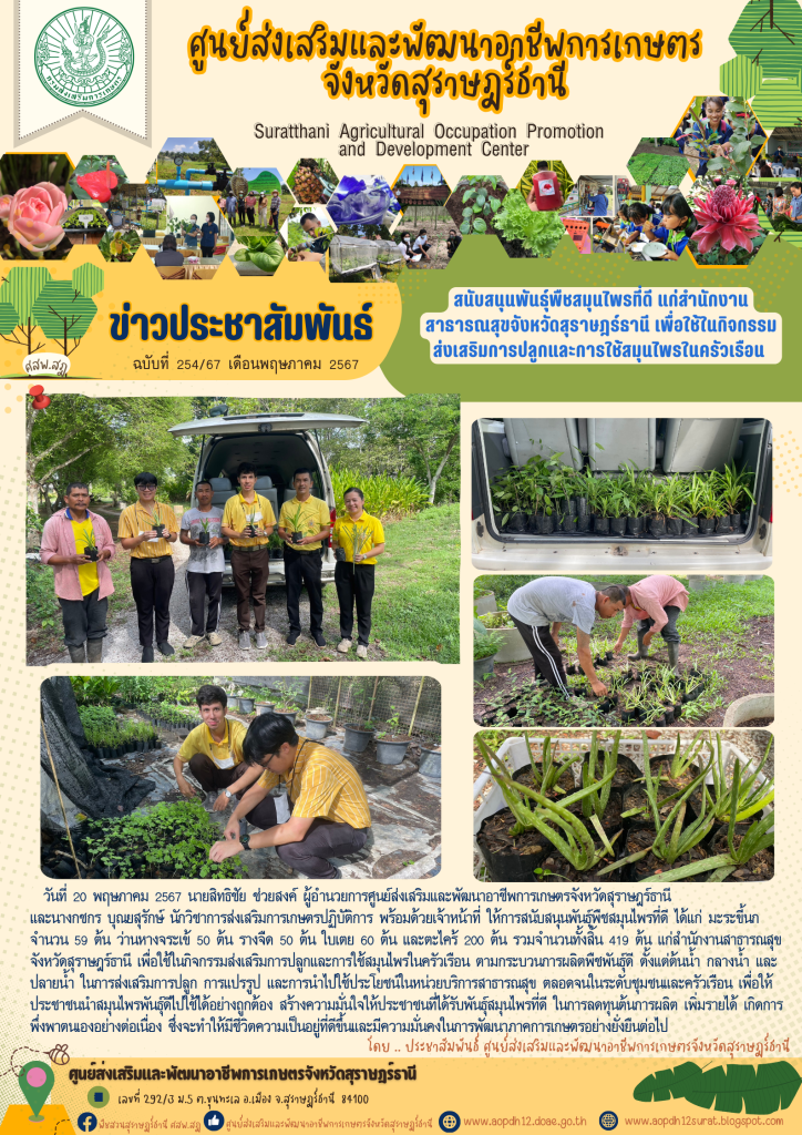 สนับสนุนพันธุ์พืชสมุนไพรที่ดี แก่สำนักงานสาธารณสุขจังหวัดสุราษฎร์ธานี เพื่อใช้ในกิจกรรมส่งเสริมการปลูกและการใช้สมุนไพรในครัวเรือน เขียนบน 20 พฤษภาคม 2024 โดย aopdh12surat ตอบกลับ