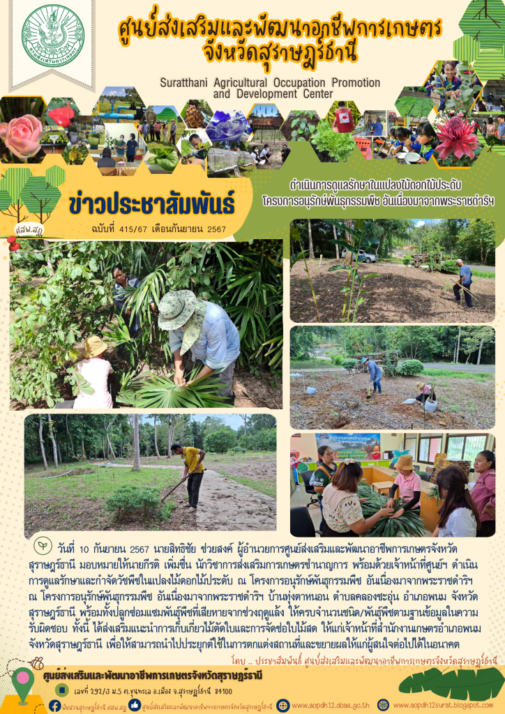 ดำเนินการดูแลรักษาและกำจัดวัชพืชในแปลงไม้ดอกไม้ประดับ ณ โครงการอนุรักษ์พันธุกรรมพืช อันเนื่องมาจากพระราชดำริฯ เขียนบน 11 กันยายน 2024 โดย aopdh12surat ตอบกลับ