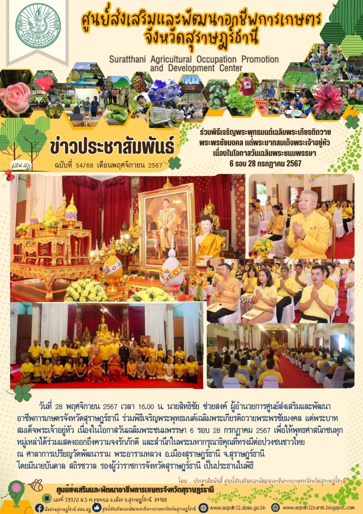 ร่วมพิธีเจริญพระพุทธมนต์เฉลิมพระเกียรติถวายพระพรชัยมงคล แด่พระบาทสมเด็จพระเจ้าอยู่หัว เนื่องในโอกาสวันเฉลิมพระชนมพรรษา 6 รอบ 28 กรกฏาคม 2567 เขียนบน 28 พฤศจิกายน 2024 โดย aopdh12surat ตอบกลับ
