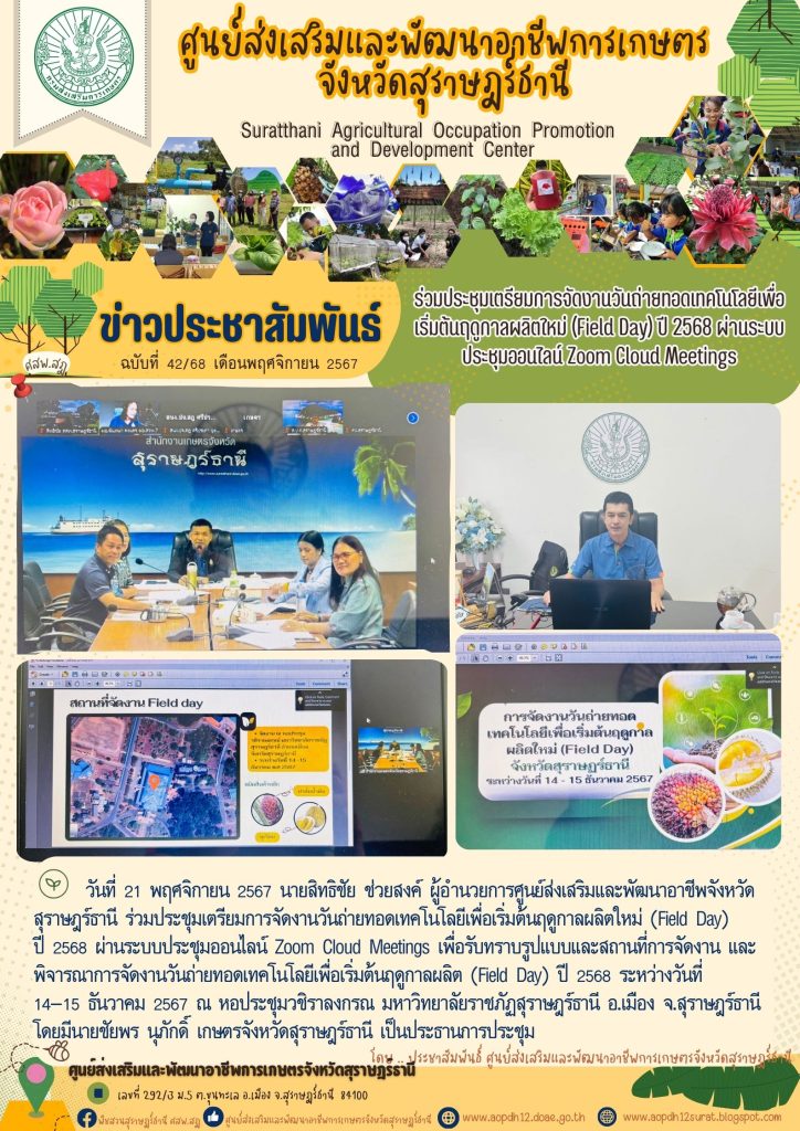 ร่วมประชุมเตรียมการจัดงานวันถ่ายทอดเทคโนโลยีเพื่อเริ่มต้นฤดูกาลผลิตใหม่ (Field Day) ปี 2568 ผ่านระบบประชุมออนไลน์ Zoom Cloud Meetings เขียนบน 22 พฤศจิกายน 2024 โดย aopdh12surat ตอบกลับ