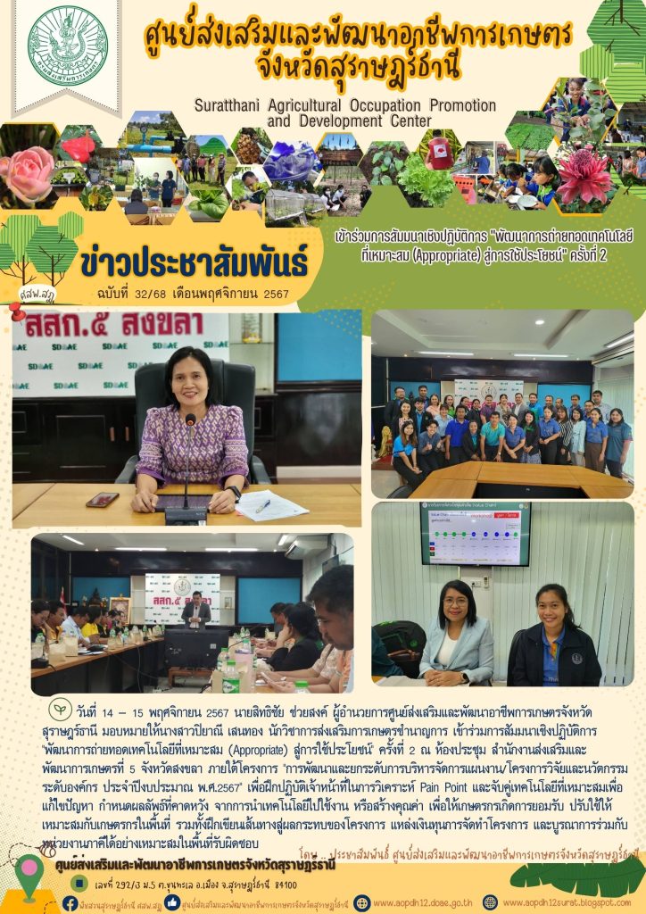 เข้าร่วมการสัมมนาเชิงปฏิบัติการ “พัฒนาการถ่ายทอดเทคโนโลยีที่เหมาะสม (Appropriate) สู่การใช้ประโยชน์” ครั้งที่ 2 เขียนบน 16 พฤศจิกายน 2024 โดย aopdh12surat ตอบกลับ