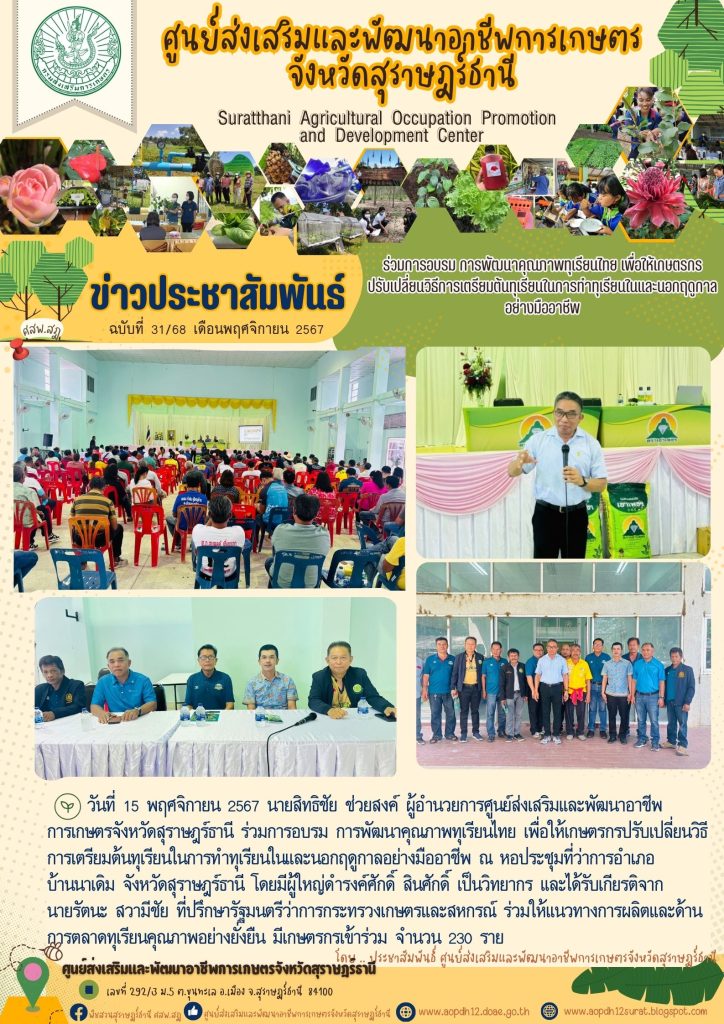 ร่วมการอบรม การพัฒนาคุณภาพทุเรียนไทย เพื่อให้เกษตรกรปรับเปลี่ยนวิธีการเตรียมต้นทุเรียนในการทำทุเรียนในและนอกฤดูกาลอย่างมืออาชีพ เขียนบน 16 พฤศจิกายน 2024 โดย aopdh12surat ตอบกลับ