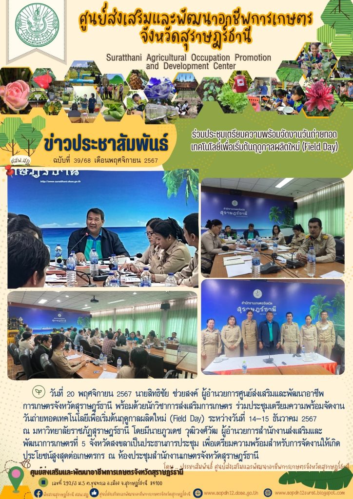 ร่วมประชุมเตรียมความพร้อมจัดงานวันถ่ายทอดเทคโนโลยีเพื่อเริ่มต้นฤดูกาลผลิตใหม่ (Field Day) เขียนบน 20 พฤศจิกายน 2024 โดย aopdh12surat ตอบกลับ